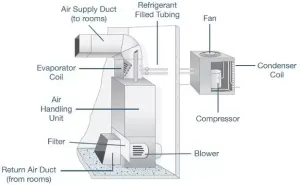 Each component in your home may be separate, such as a radiant system combined with window air conditioning units. However, it is more common for combined systems such as central heating and AC systems that use a single blower to circulate air via internal ducts in a home, or with a ductless system for different rooms or zones in the house.